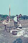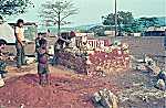 Enquanto o velho Manel vai pacientemente colocando tijolo ao lado de tijolo, sobre o lar já construído, um miúdo da sanzala amassa o barro com os pés. (Slide refª 254)
