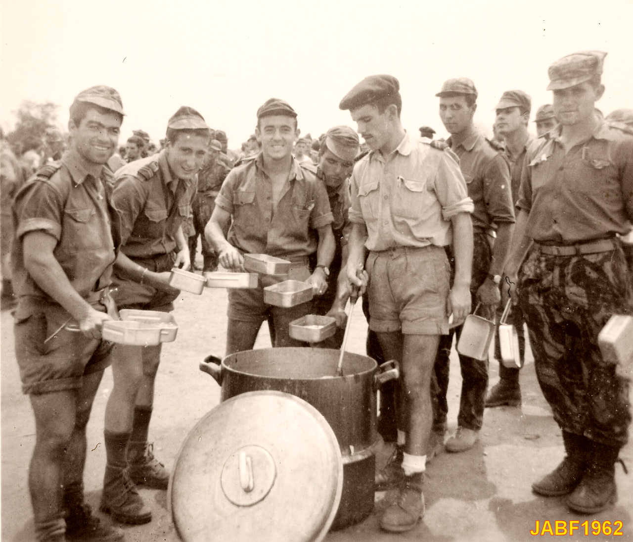 Recebendo o rancho. Nomes: 1.???; 2.???; 3.???; 4.???; 5.???; 6.???; 7.???; 8.???.