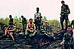 Nuvem de gotículas de água provocada pelos rápidos e Quedas Guilherme, no rio Cuango, entre o Zaire e Angola. Ao longe, uma povoação e base militar zairense.