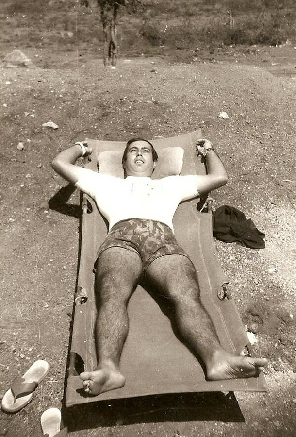 Jacinto Ramos sentado no cimo de um morro feito pelas formigas.