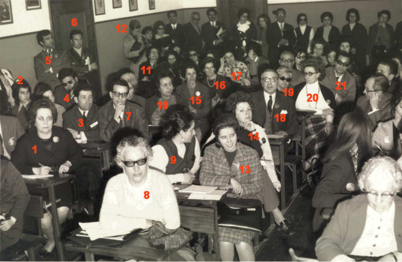 NOMES: 1.???; 2.???; 3.Graça Veleda; 4.???; 5.José Lau; 6.Maria Adelaide Lau; 7.???; 8.Carneiro da Silva (Mat.); 9.???; 10.???; 11.Orlando de Oliveira (Reitor); 12.???; 13.José Pereira Tavares (antigo reitor); 14.???; 15.Álvaro Sampaio; 16.Albano da Conceição; 17.Euclides Araújo; 18.???; 19.???; 20.???; 21.???; 22.Alfredo Santos; 23.Padre Mário Sardo; 24.Helena Vidinha; 25.Palmira Araújo; 26.Sá Chaves; 27.Idália Sá Chaves; 28.Jorge Godinho; 29.Cecília Sacramento; 30.???; 31.???; 32.???; 33.???; 34.???; 35.Joana Vaz; 36.José Matos; 37.Noémia Margarida; 38.???; 39.Amélia Rosa; 40.???; 41.???; 42.???; 43.???; 44.Natália Pires; 45.Teresa Caldeira; 46.Rosa Amélia; 47.Maria Vieira; 48.???; 49.Alda Gomes; 50.Alice Barata Salgueiro; 51.???; 52.???; 53.???; 54.Eneida Piçarro; 55.Lucinda Conceição; 56.???; 57.Maria Otília Osório; 58.Palmira Couto; 59.Helena Maltez; 60.Lurdes Boavida; 61.António Maltez; 62.Venília Sá; 63.Fátima Bóia; 64.???; 65.Aurélio Fernandes; 66.Ermelinda Campos; 67.Lindonor Silveirinha; 68.José Melo Cunha.
