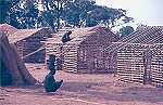 Secagem ao sol dos adobes de argila. Na imagem, vê-se uma cubata construída com este material. Ao fundo, molhos de colmo para os telhados. (Slide refª 1001).