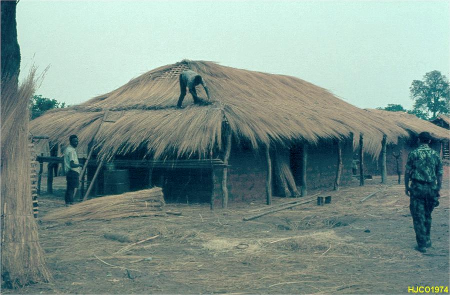Construção da estrutura que irá suportar a cobertura de colmo da cubata. Estas, construídas com estacas de madeira, são depois revestidas de argila. (Slide refª 1004).