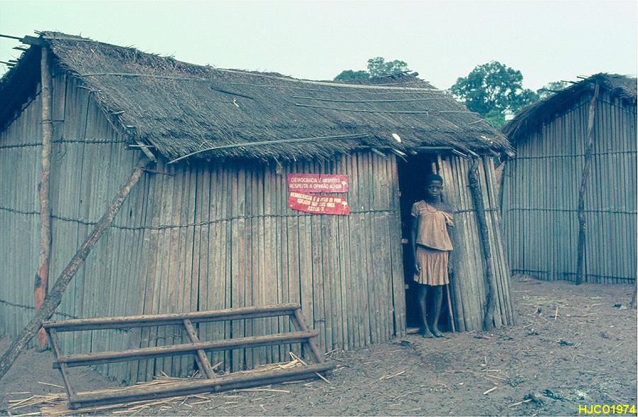 Rapariga à porta da cubata. Atente-se nos cartazes colados nas cubatas, num período posterior ao 25 de Abril de 2004. (Slide refª 1010).