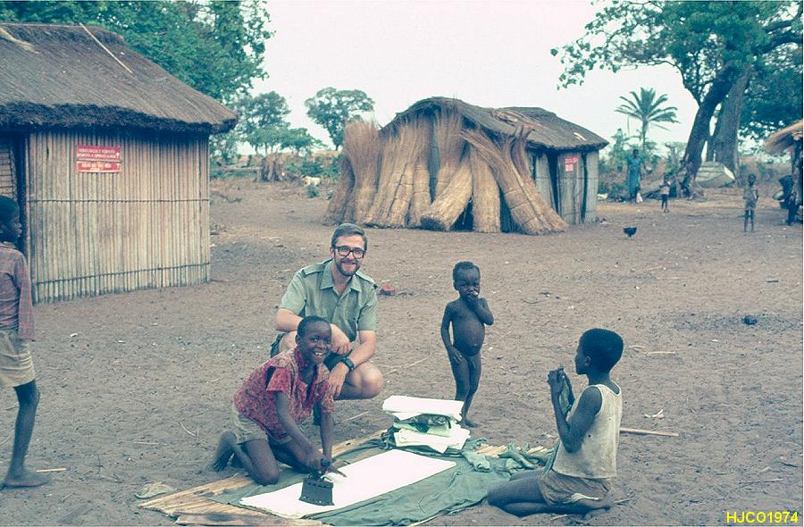 Alferes Oliveira na companhia do lavadeiro, o mocito da sanzala que lhe lavava a roupa e a passava a ferro. Ao fundo, encostados a uma cubata, os molhos de colmo para cobertura das cubatas. (Slide refª 1011).