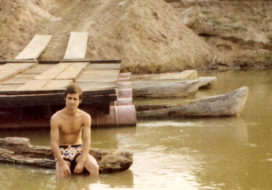 Pormenor do José Alberto Farinha sentado num dongo (canoa) no frio Marimba, onde se vinha fazer o abastecimento de água para o quartel.