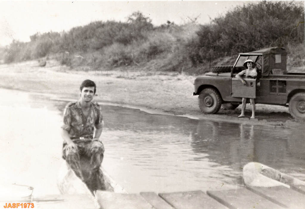 Condutor Farinha sentado na canoa. Condutor Carvalho junto ao célebre Landrover com volante à direita.