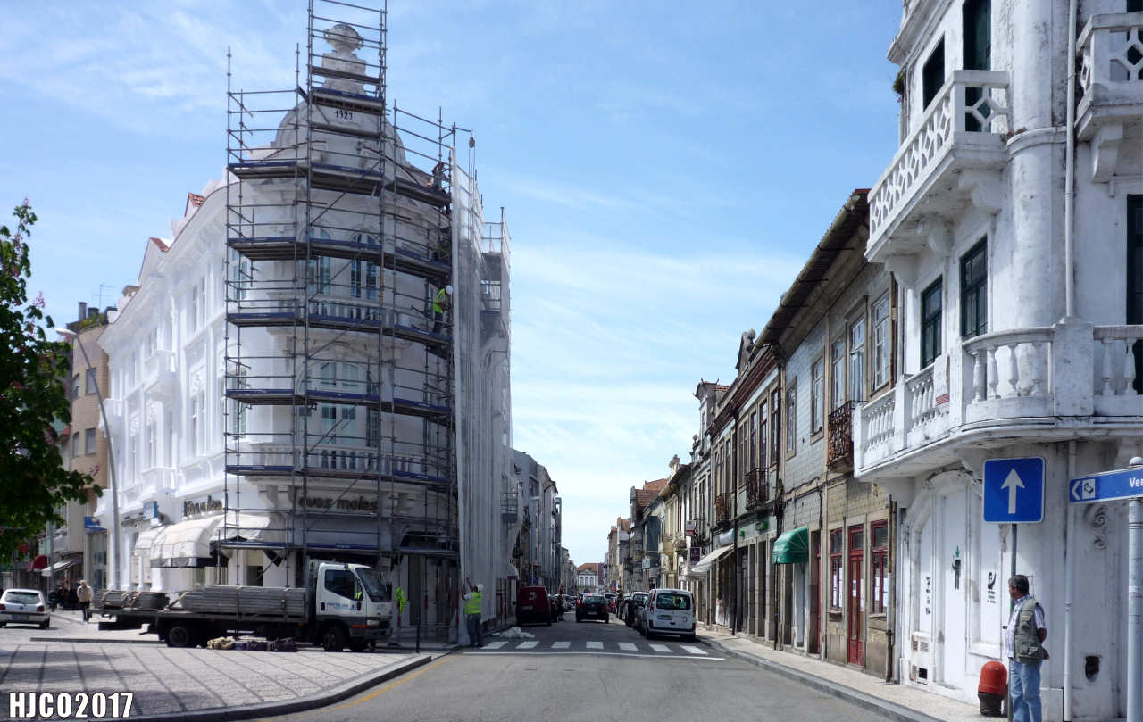 Rua Cândido dos Reis em 29 de Abril de 2017, vendo-se, à direita, o primeiro edifício onde outrora existiu uma pensão e que, em Maio de 2017, foi abatido para dar lugar a nova construção.