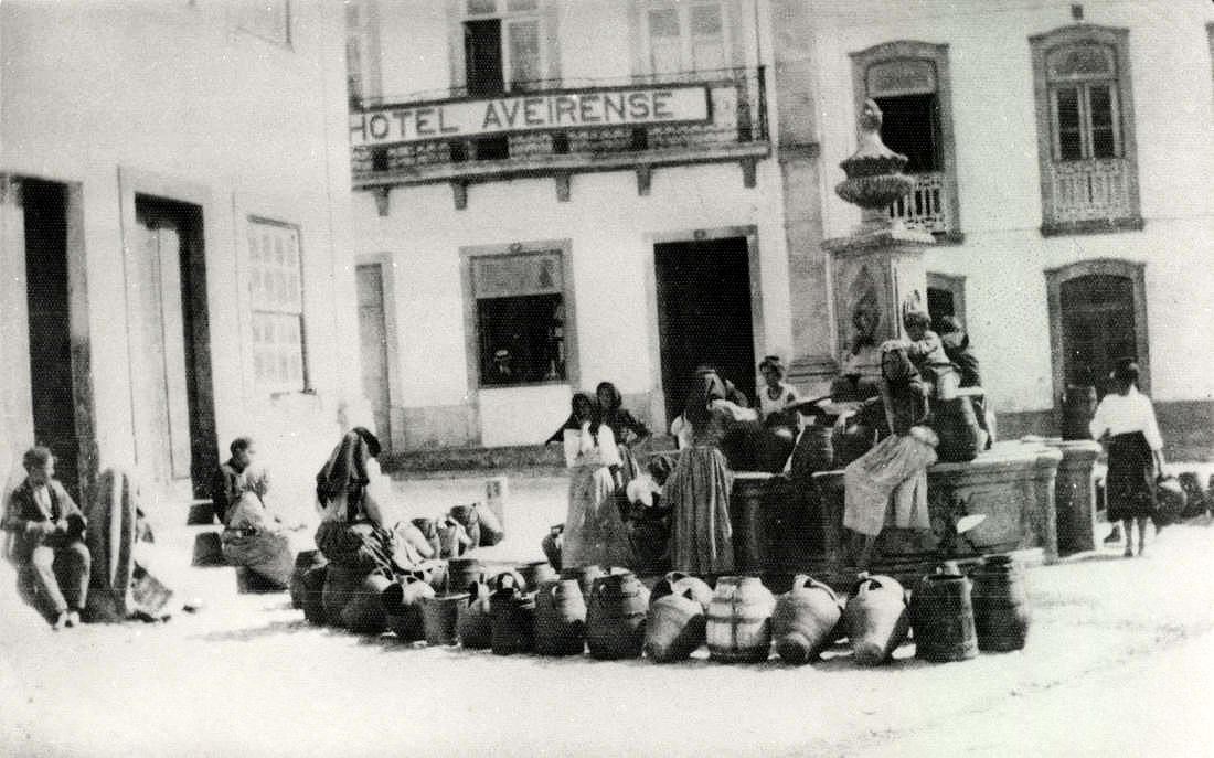 Antiga fonte da Vera-Cruz, onde a população aveirense desta zona da cidade se abastecia de água. Em frente, o Hotel Aveirense. Era ao fundo desta rua que começava a Rua do Gravito.