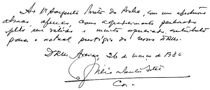 Esta dedicatória que se reproduz, além de registar a caligrafia do autor, teve para nós o mérito de nos permitir descobrir a autoria do trabalho, uma vez que não existe a habitual ficha técnica e o nome do autor ao longo da publicação. Ele só surge quase no fim do trabalho, na página 77, por baixo da fotografia do Coronel Júlio dos Santos Batel, que era então o chefe do D.R.M. de Aveiro.