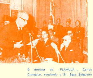 Também em palavras breves, mas muito sentidas, o Director da «FIâmula», Sr. Carlos Grangeon, saudou calorosamente o Sr. Comendador Egas Salgueiro, em nome dos 1.200 empregados e operários da. E. P. A., enquanto um grupo de empregadas lhe oferecia uma bonita «corbeille» de orquídeas e a sua Esposa, Ex.ma Sr.ª D. Ascensão Salgueiro, que assistia numa frisa, um ramo de cravos vermelhos.