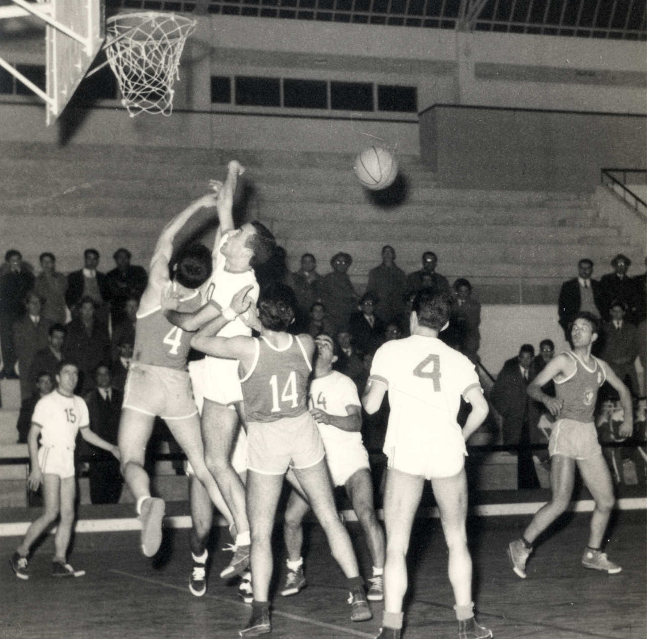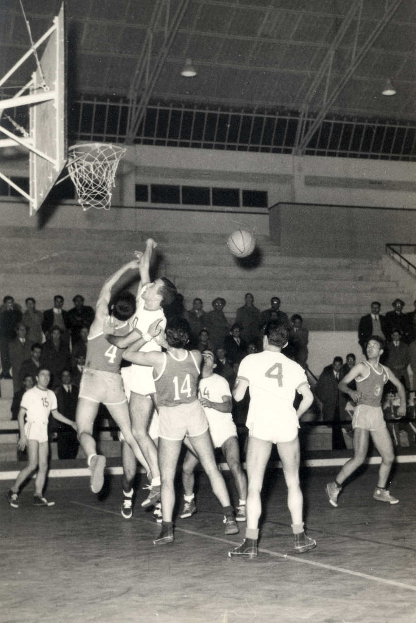 2 e 3. Final de basquetebol de seniores em S. João da Madeira entre Galitos e Sangalhos, em que estes ganharam aos Galitos por 5 pontos. 16 de Janeiro de 1962.   4 - Outro momento do mesmo jogo.