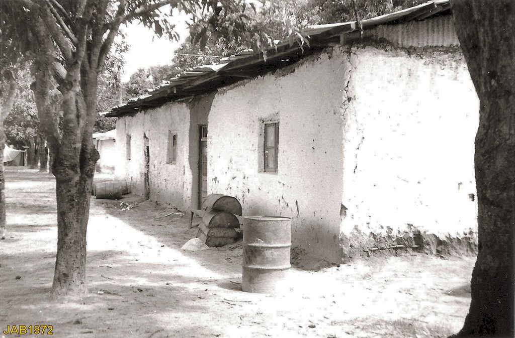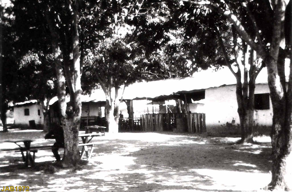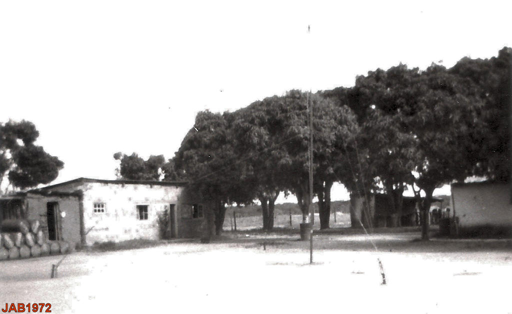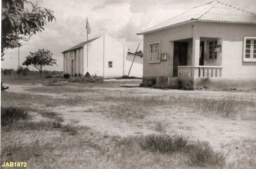 Traseiras da casa do administrador (edifício ao fundo). À esquerda o edifício da Pide/DGS, a enfermaria, o gabinete do capitão e quartos da messe de sargentos e oficiais, localizados fora do armado farpado.