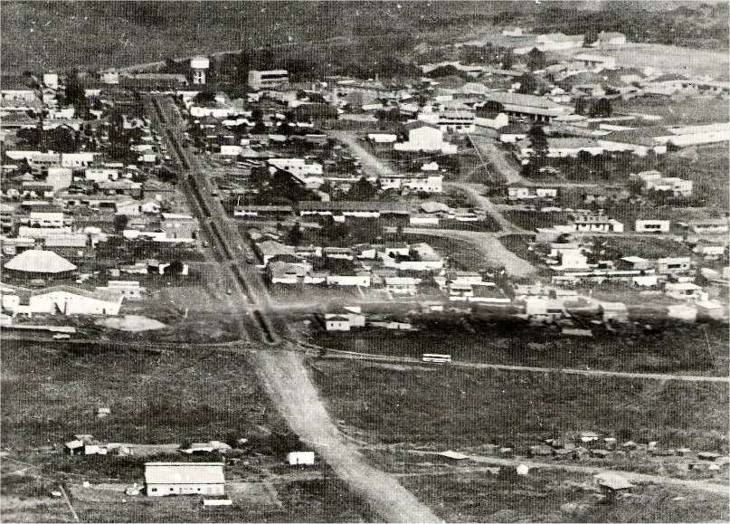 Panorâmica aérea da cidade do Negage, predominando a estrada de acesso à entrada na cidade, que vinha do Uíge. Maria Orquídea Lima - Data: ??/??/???. Ficheiro: Negage12.jpg - 109 KB