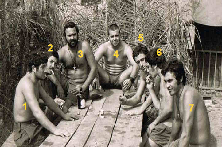 Furriel Eduardo Magalhães, ao centro e no topo da mesa, na companhia de camaradas de Engenharia. Para ver nomes: 1.???; 2.???; 3.???; 4.furriel Eduardo Magalhães; 5.???; 6.???; 7.???.