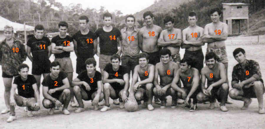 Torneio entre pelotões da Companhia de Caçadores 3387. Identificação; 1 - Marcelo; 2 - Ponte; 3 - ??; 4 - Fernandes; 5 - Benjamim; 6 - ??; 7 - ??; 8 - Domingos; 9 - Alf. Ribeiro; 10 - ??; 11 - ??; 12 - ??; 13 - Teixeira; 14 - Moreira; 15 - Leitão; 16 - Sousa Elect.; 17 - Mimoso; 18 - Romão; 19 - Silvestre; 20 - Nelson; 21 - Adelino