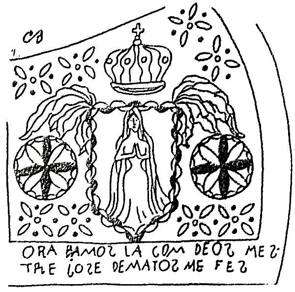 Dentro de um pomposo escudo com coroa real no cimo, uma santa de mãos postas, vestes cintadas, largo manto caído: «Ora bamos lá com Deus!»  − reza a divisa. «Mestre José de Matos me fez.». Um figurão de grande decalitro na cabeça, muito delambido, gesto de muscadim, oferece uma rosa à dama inexpressiva: «Arreda que te ispeto!»  Uma nédia moça de enormes seios esféricos e sintomas de próxima maternidade: «As moIheres quer-se boas.». Um cavalheiro de chapéu fadista pedindo lume com o cigarro na mão a um velho ginja de grande cachimbo recurvo: «Ora banha de Iá eça fumaça.»