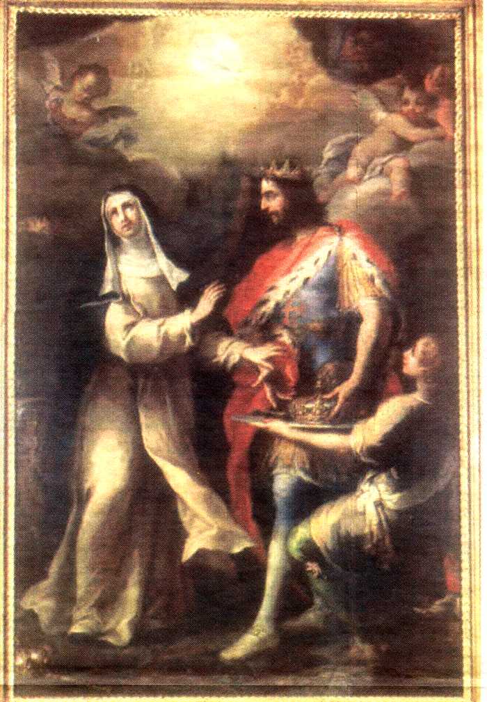 Roma – Igreja de Santo António dos Portugueses. À esquerda, Stª Joana e D. João II. Óleo sobre tela, 212x139 cm., de Michelangelo Cerruti (1666-1748). Em cima, fachada da igreja, vendo-se por cima da janela o brasão de Portugal.