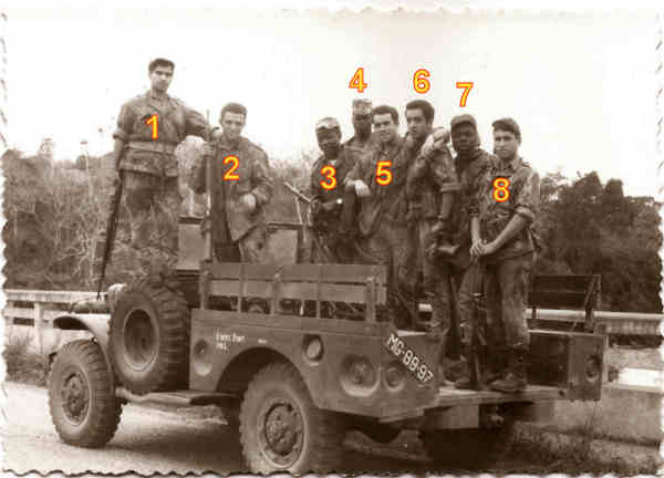 Na ponte em cima do M'bridge, na estrada Ambrizete-Bessa Monteiro, mesmo antes da bifurcação para o Tomboco. Nomes: 1."Infantaria" (Santinho Neves); 2.Barelas; 3.Tropa auxiliar; 4.???; 5.Tadeu; 6.CAbo do Negage; 7.???; 8.Coelho.   António Vilela (PAA962) - 1964/65. Ficheiro: Ambrizete31.jpg - Ver números