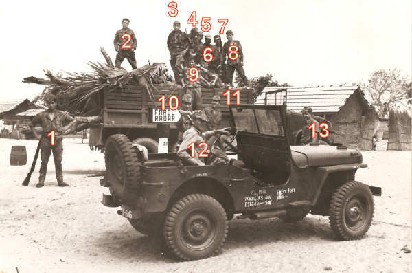 Regresso ao quartel, com folhas de palma para decoração da festa dos 2 anos de comissão. Neste dia, até foi arranjada uma tabuleta para o trânsito. Nomes: 1.???; 2.???; 3.???; 4.???; 5.???; 6.???; 7.???; 8.???; 9.???; 10.???; 11.???; 12.A. Vilela; 13.???.  António Vilela (PAA962) - Agosto de 1966. Ficheiro: Ambrizete39.jpg - Ver números