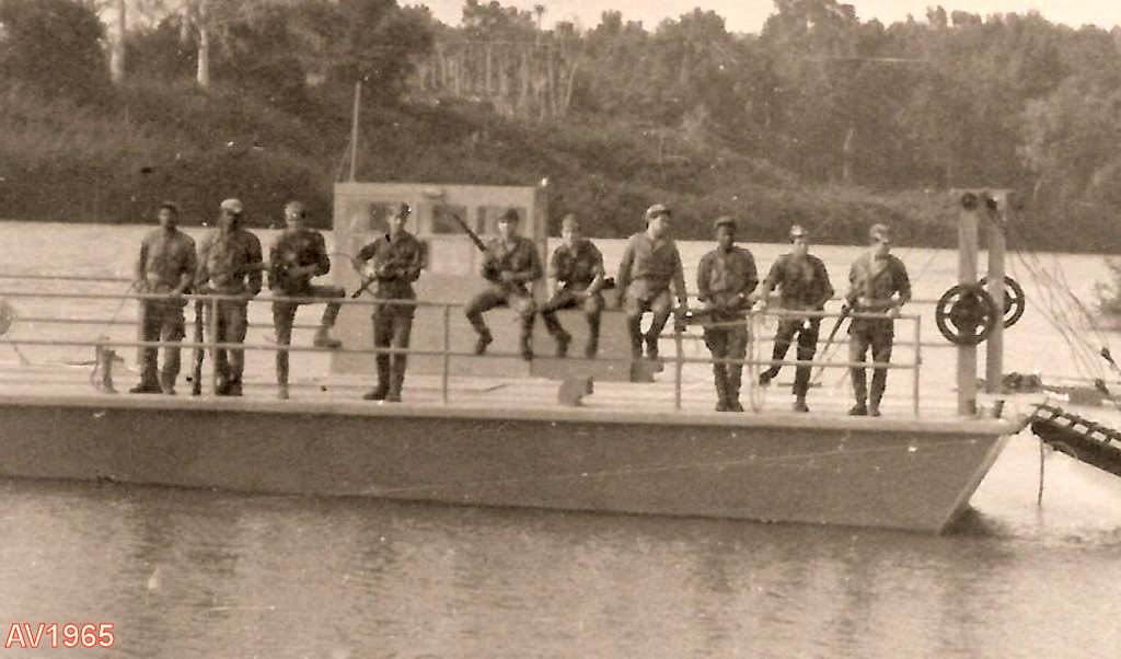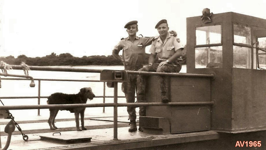 Ambrizete, Foz do M'bridge 1965. Na nova jangada, António Vilela com o saudoso Horácio Garcia Quinaz (sentado), comandante do PAD 921, mais a respectiva cadela.