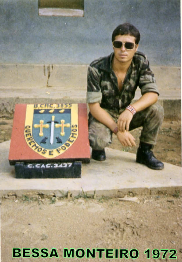1º cabo Manuel Rodrigues junto do crachá construído em frente à caserna.