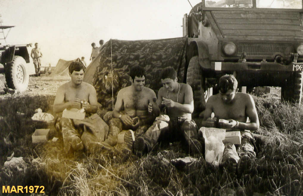 Momento de descanso no acampamento para comer a ração de combate. Da esq.ª para a dtª: ???, ???, ??? e ???.