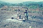 Mulher sentada ao pilão junto