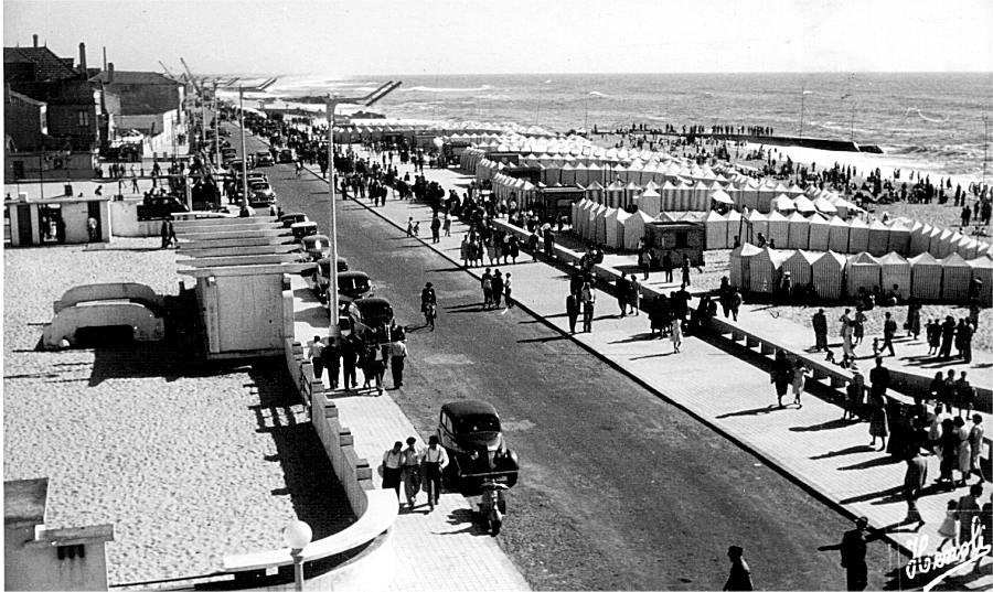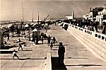 Aspecto da esplanada e praia de Espinho em plena época balnear por volta de 1953, vendo-se à esquerda, em primeiro plano, o parque infantil e, mais adiante, o ringue de patinagem. Ver mais adiante outro ângulo da mesma área. [Esplanada 1]  Postal ilustrado editado na época.