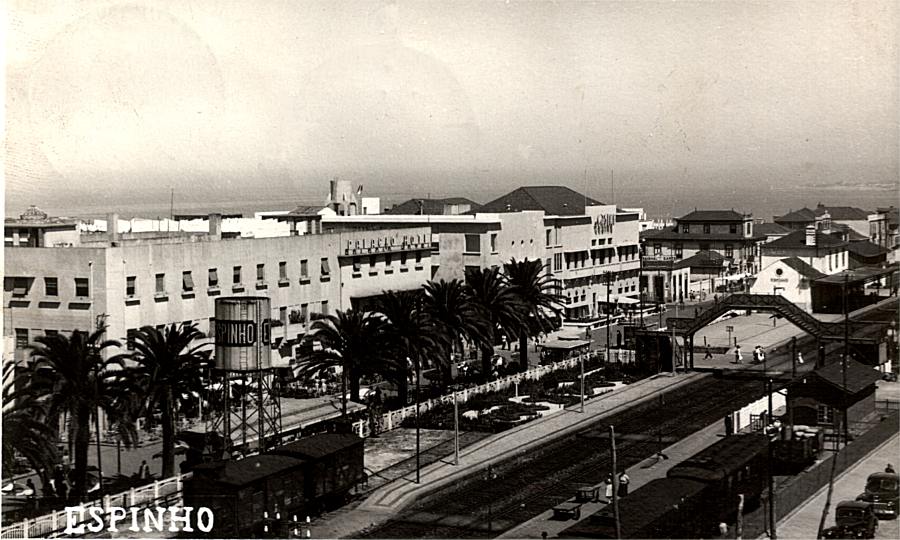 Aspecto de Espinho na primeira metade da década de 1950, vista da torre da Igreja matriz. O edifício com um depósito de água sobre o telhado é o cinema S. Pedro.