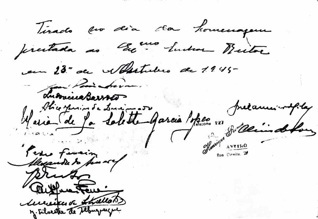 1 e 2. Homenagem ao reitor Dr. José Pereira Tavares, em 23 de Outubro de 1945 (frente e verso). Foto 12x18 cm gentilmente cedida por D. Luísa Pericão. Ver NOMES.