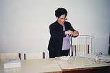 4.Montagem da exposição pela professora Rosa Mancelos.