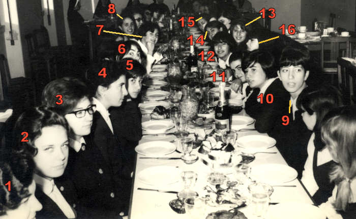 Festa do final de ano lectivo no refeitório. Nomes: 1.???; 2.???; 3.???; 4.???; 5.???; 6.???; 7.???; 8.???; 9.???; 10.???; 11.Celeste; 12.Manuela Moreira Lopes; 13.???; 14.???; 15.???; 16.???.