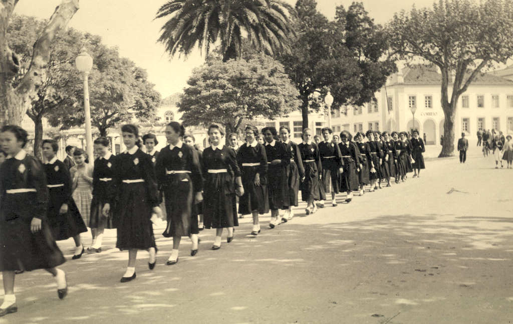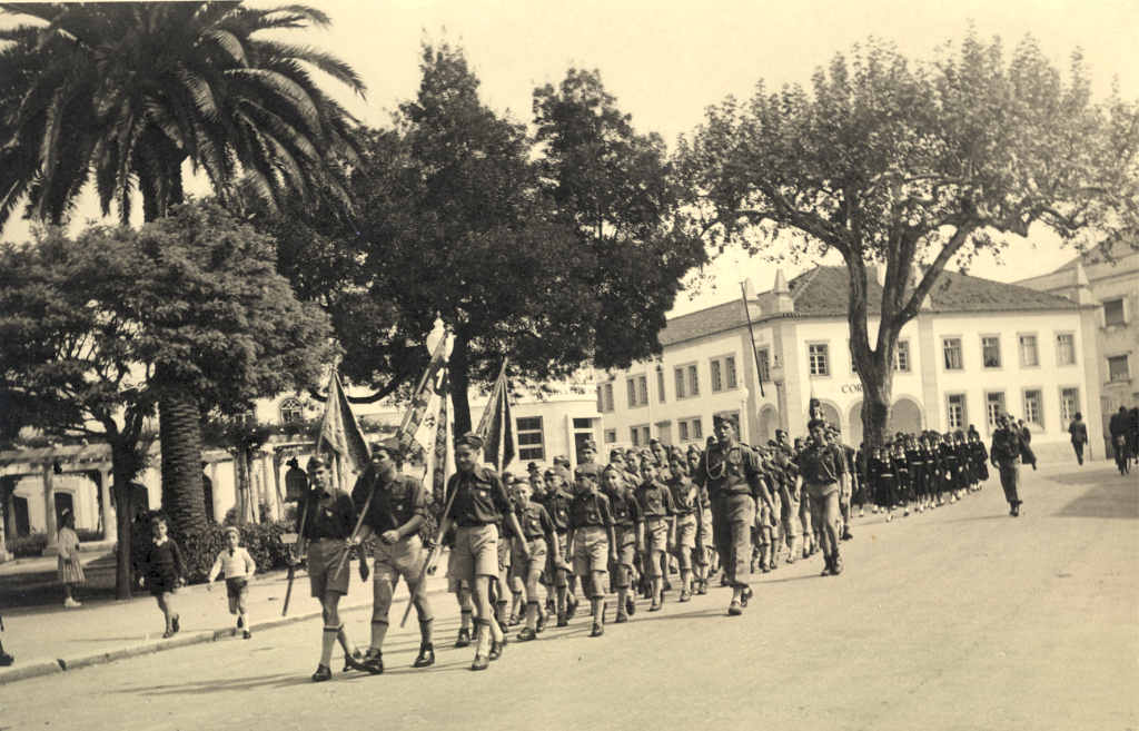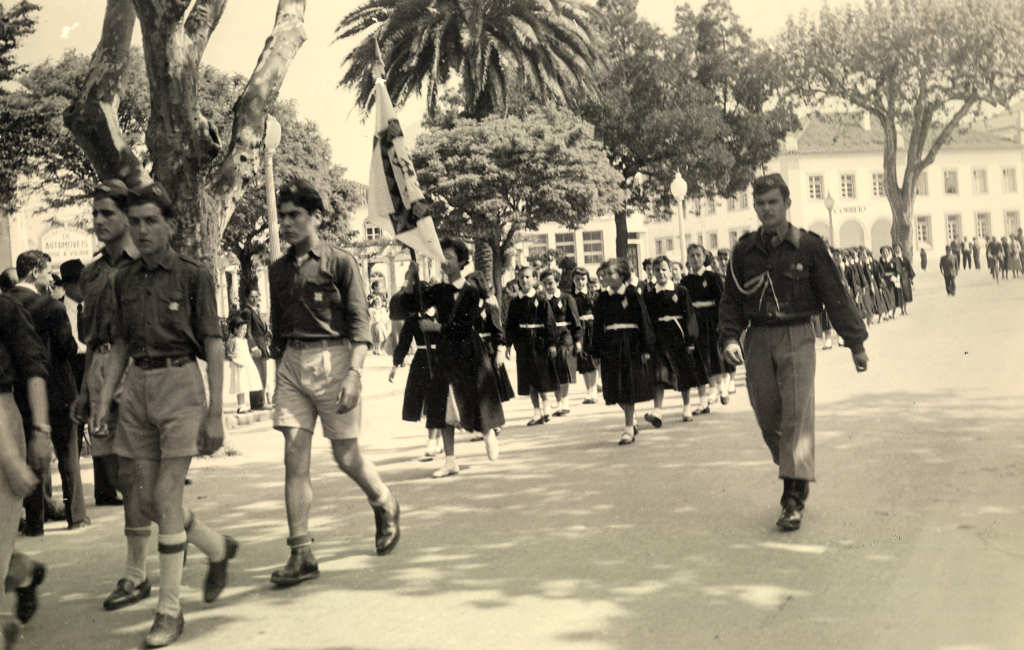 26. Depois da sessão solene, desfile no Cardal dos meninos e meninas da Mocidade Portuguesa para a inauguração da Rua Capitão Tavares Dias. Entre muitos, destacam-se à frente (?) Armando Gonçalves Gameiro e Luís Mineiro.