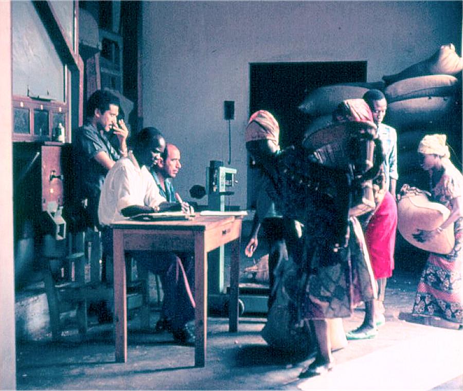 Aspecto de Quimbele em dia de mercado de ginguba (amendoim). Na imagem, a pesagem da ginguba, efectuada pelo Sr. Ulisses, auxiliado por outro elemento sentado à sua direita.  Sector de Uíje - Carmona - Angola.