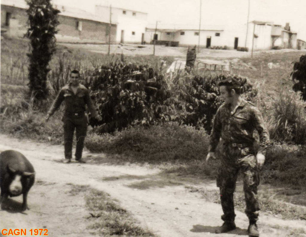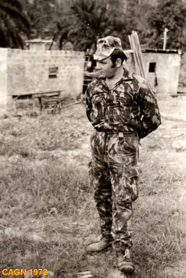 Partida da Companhia de Caçadores 3387 para a Intervenção no Grafanil. Números: 1.Ferraz (malhado); 2.Lourenço (cripto); 3.Firmino; 4.Mário (padeiro); 5.Gaiolas; 6.Orlando; atrás do 7 o Albino; 7.???.