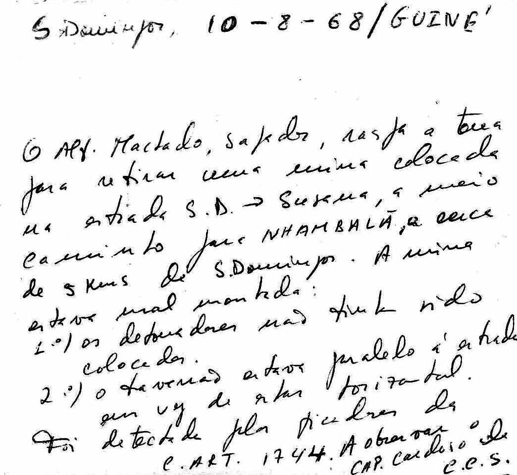 Prestei serviço em S. Domingos e noutros locais, porque fazia parte da CART 1744, companhia de intervenção às ordens do Comando-Chefe, pelo que, para além de estar sedeada em S. Domingos, esteve em intervenções em Susana, Varela, Ingoré e Cacheu, tendo combatido em Ingoré, Susana e S. Domingos. A mina, cuja foto foi enviada pelo camarada Eduardo, de que já não me recordo, foi detectada em operação de picagem, mesmo ao meu lado, com as duas granadas incendiárias, que só por mero acaso não ocasionaram vítimas, porque o instalador se esqueceu de retirar a segurança dos detonadores. Pensa-se que, aquando da montagem da mina acompanhada, foi feito um ataque a uma povoação que foi socorrida em tempo recorde, pelo que as viaturas de socorro passaram por cima das minas, não sendo accionadas por erro do instalador dos artefactos. Posteriormente, numa visita de apoio psicológico para manter o ânimo das populações da povoação atacada, com trabalho de picagem, é que a mina foi descoberta.