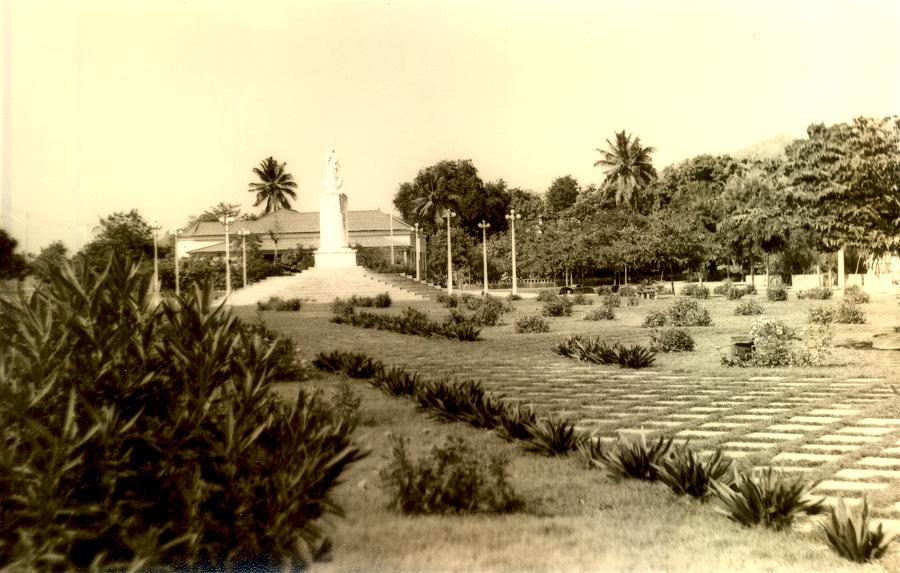 Palácio do Governo. À frente, o jardim da cidade de Dili com o monumento dedicado aos Descobrimentos e a D. Henrique.