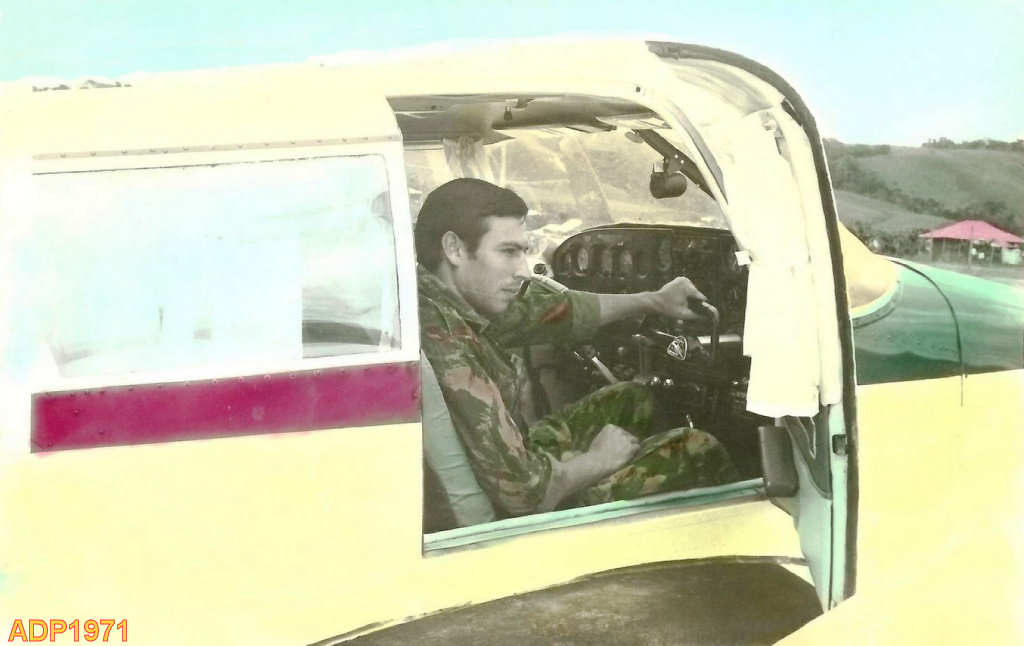 Antonino Duarte Pereira sentado no interior de uma avioneta em Vale do Loge.