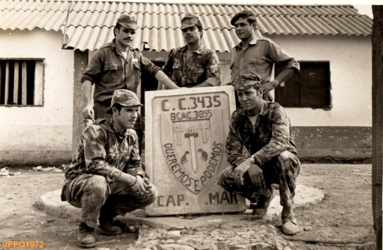Em Vale do Loge em 1972, junto ao memorial da Companhia de Caçadores 3435 do Batalhão de Caçadores 3855. Da esquerda para a direita: ???, ???, ???, ??? e ???.