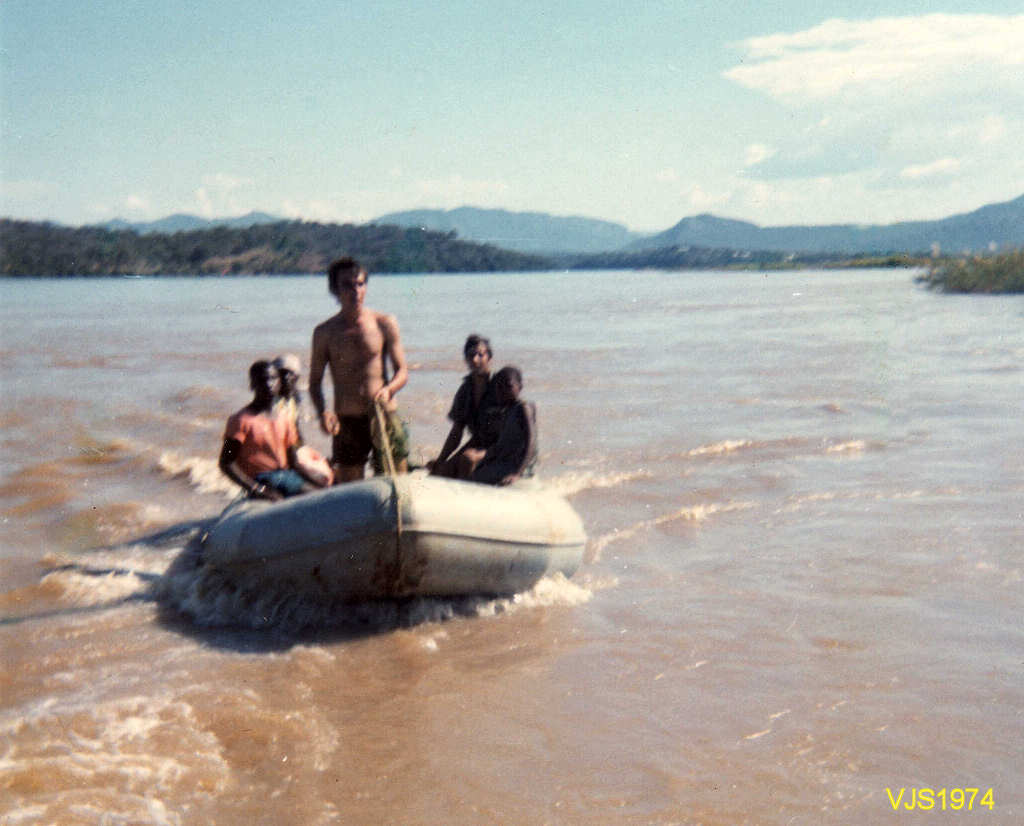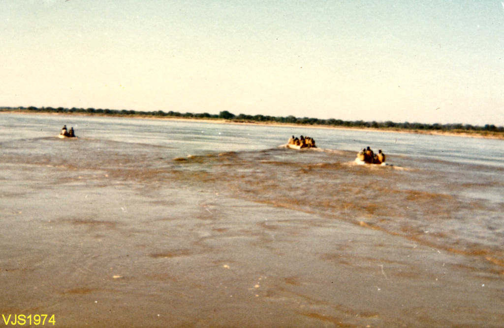 Jangada a atravessar o rio Zambeze. Da esquerda para a