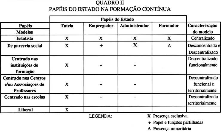 O QUADRO II expressa os "Papeis do Estado nessa Formação Contínua".