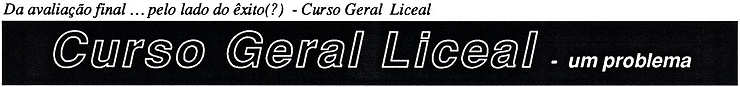 É difícil fazer uma análise do rendimento do Curso Geral Nocturno. Nos anteriores números do «Aliás» tínhamos prometido tentar uma abordagem do problema do rendimento do Curso Geral Liceal, até para comparar com o rendimento do Curso Geral por unidades capitalizáveis. Considerámos, no entanto, que não eram comparáveis por uma análise pouco profunda, quer pelas diferenças essenciais no tipo de avaliação – enquanto no Curso Geral Liceal os alunos só aproveitam ano a ano, no Curso Geral por U.C., os alunos aproveitam unidade a unidade – quer pelas diferenças no tamanho das turmas, no tipo de leccionação e no controle da assiduidade.