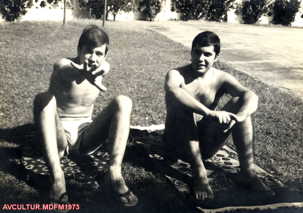 Manuel Matias e ???? sentados no relvado da piscina do Clube de Oficiais em 1973.