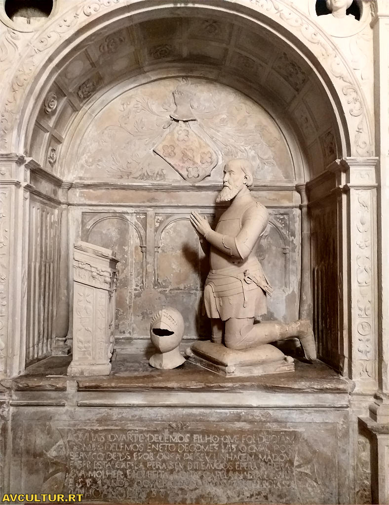 em traje guerreiro, ajoelhado sobre o túmulo. A estátua orante tem 1,4