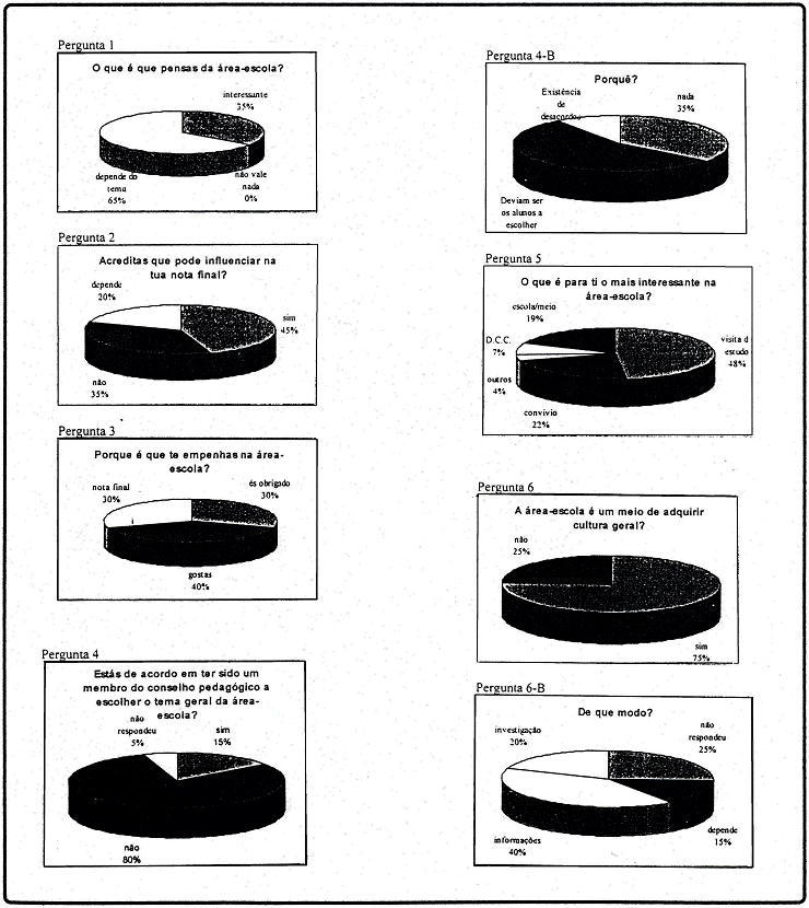 Mas o que pensam realmente os alunos da Área-Escola? Num inquérito a vinte alunos da nossa Escola (quinze do Secundário e cinco do Unificado), chegámos à conclusão que os alunos consideram a área-escola interessante, embora dependa do tema a tratar. Um pouco incrédulos, não acreditam que o seu empenho no trabalho da área-escola da turma possa vir a alterar a sua nota. A maioria não concorda que seja um grupo de professores a escolher o tema a abordar, quando este vai ser trabalhado pelos alunos; os alunos sentem-se no direito de o escolher, embora tenham consciência que isso iria despertar desacordos entre eles. Para a maior parte dos alunos, o mais interessante no trabalho é a visita de estudo, quando esta existe, porém muitos acham simpático o convívio que se verifica entre alunos e professores; pensam também que é um modo de adquirir mais cultura e informação.