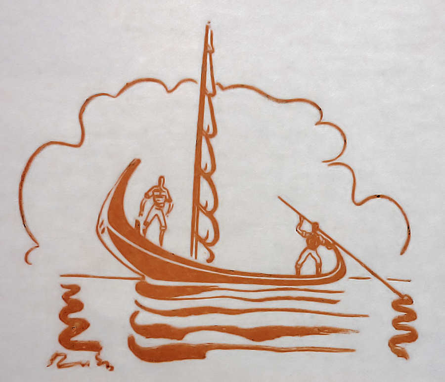 arrais, S. Pedro bota as redes enquanto, sentado na proa, Jesus abençoa