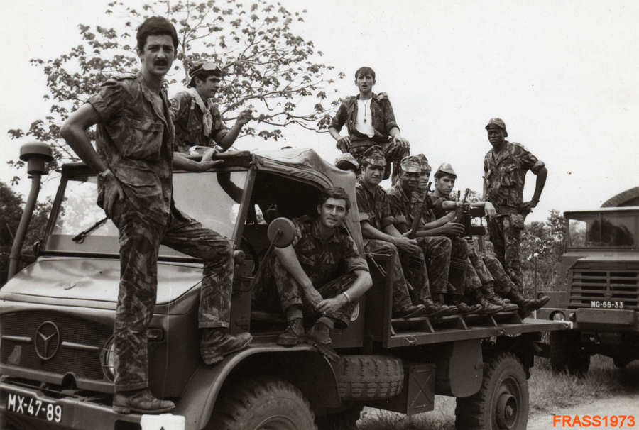 76 - Elementos da C. Caç. 3387 sobre a ponte do rio Lué. Autor Francisco Ricardo A.S.Silva. Março 1972.   77 - Regresso a Luanda, após uma operação na zona do Terreiro (Quiquiemba) em Fev. 1973.   78 - Aurélio e  Leoner, após uma caçada. Quixico - 1972.