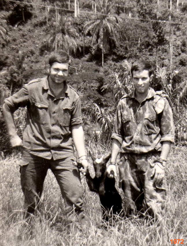 79 - Quixico, 1971. Malta dos furriéis Costa e Puga de regresso ao quartel, após um reconhecimento na mata. 80 - Após a entrega de G3 novas e testadas. Esq.>Dtª frente: Ponte, Ferreira; atrás cor Aguiã, Branquinho. Autor: António Ferreira. 81 - QUIXICO. José M. Godinho (Furriel Alimentação) e Mário Silva (Padeiro) falando acerca da ementa em 04-04-1972