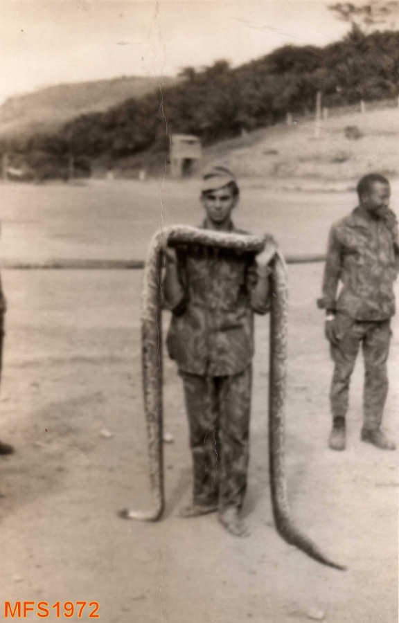 Mário Silva com a jibóia morta na pista de aviação. Ao fundo, o posto de